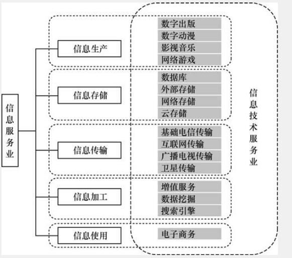 在比较中,“其他信息相关服务”内容宽泛,涉及面极广,包括录制媒体的出版、印刷和复制以及娱乐、文化和体肓活动等,接近文化产业的概念。
