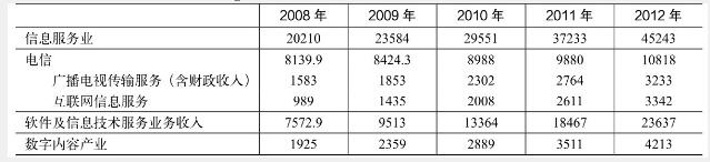 经过对信息传输服务业、信息技术服务业和信息内容服务业的必要调整,我们可以看到我国的信息服务业总体发展势头良好,2012年年底产业规模达到45243亿。